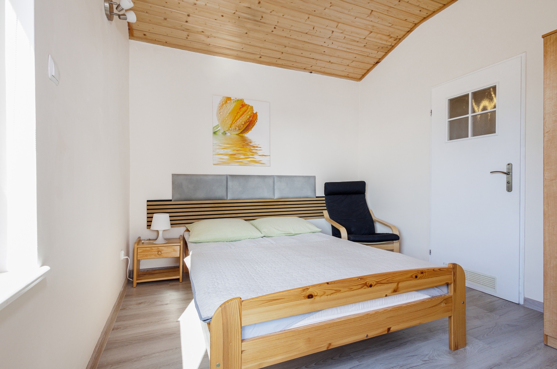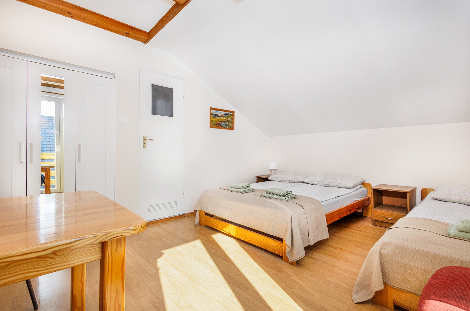 - pierwsza sypialnia : 1 dwuosobowe łóżko, 1 łóżko pojedyncze, szafa, komoda, stolik nocny