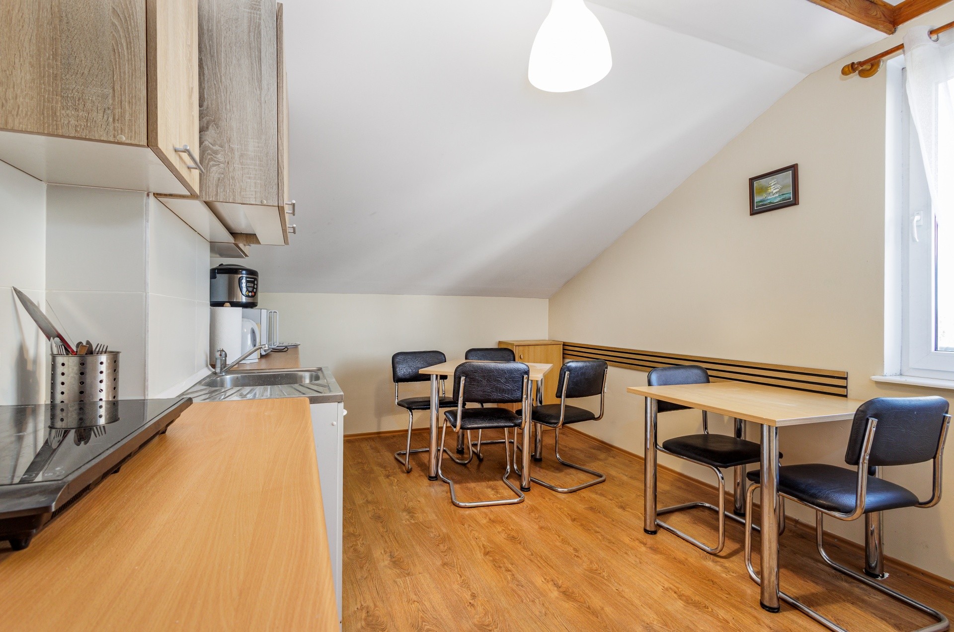 - wyposażenie kuchni (czajnik, płyta grzewcza, naczynia, garnki, sztućce)