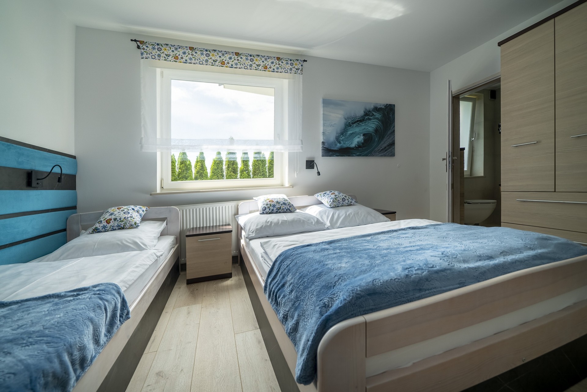 - oddzielona sypialnia (łóżko 140 cm + 2x łóżko 90 cm)