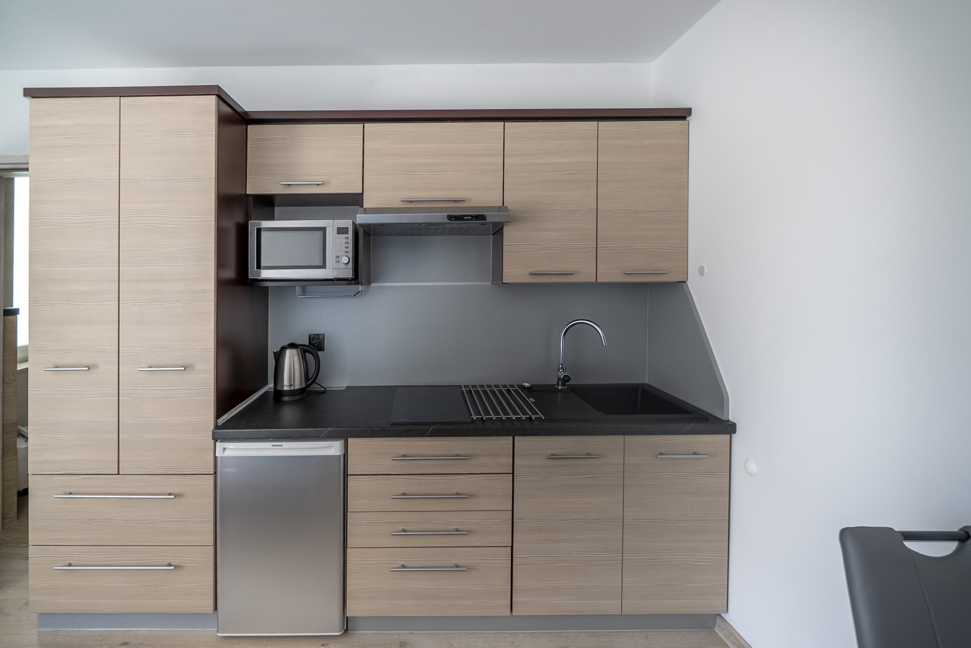 - w pełni wyposażona kuchnia, sprzęt kuchenny (kuchenka indukcyjna, lodówka, mikrofalówka, czajnik elektryczny, zmywarka,)